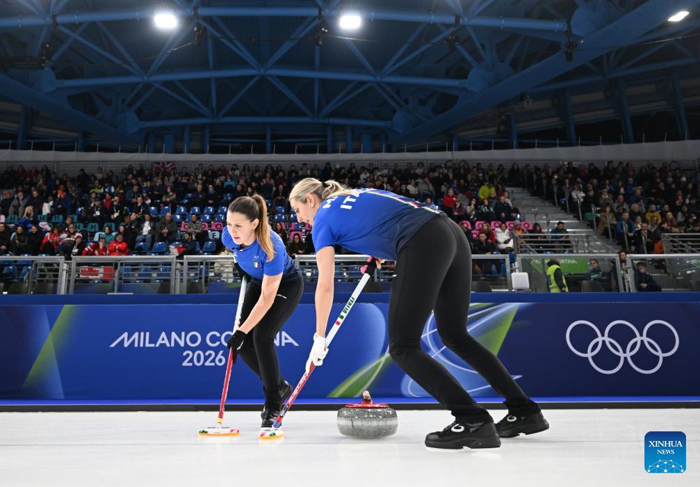 Elena Mathis (R) and Marta Lo Deserto of Italy competes during the curling women round robin session 4 match between China and Italy at the 2026 Milan-Cortina Winter Olympics in Cortina, Italy, Feb. 14, 2026. (Xinhua/Lian Yi)