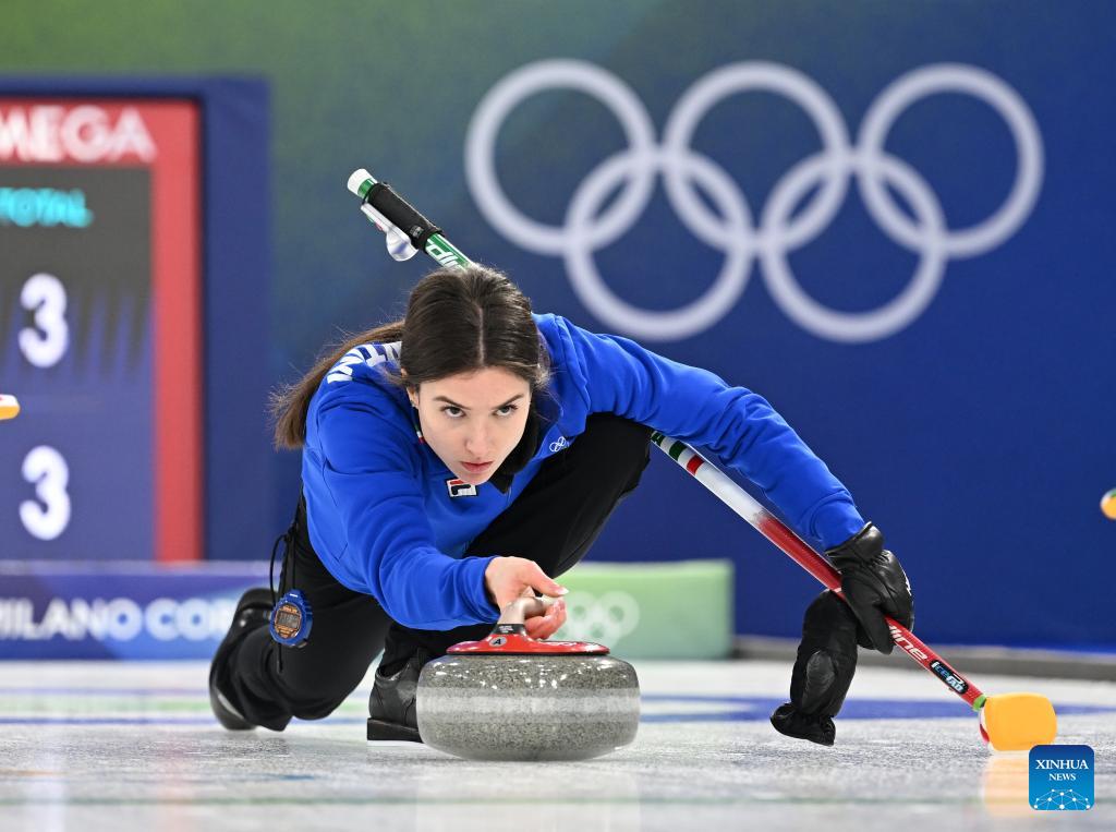 Elena Mathis (C) of Italy competes during the curling women round robin session 4 match between China and Italy at the 2026 Milan-Cortina Winter Olympics in Cortina, Italy, Feb. 14, 2026. (Xinhua/Lian Yi)