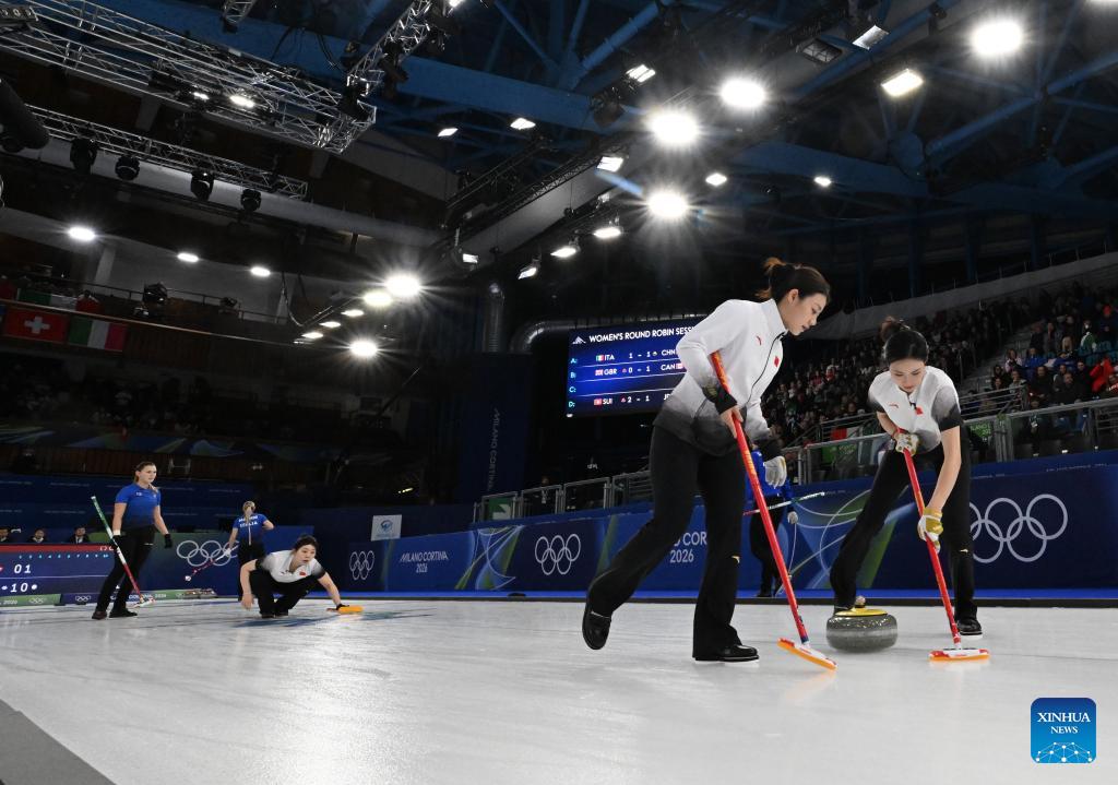 Wang Rui (C) of China competes during the curling women round robin session 4 match between China and Italy at the 2026 Milan-Cortina Winter Olympics in Cortina, Italy, Feb. 14, 2026. (Xinhua/Lian Yi)