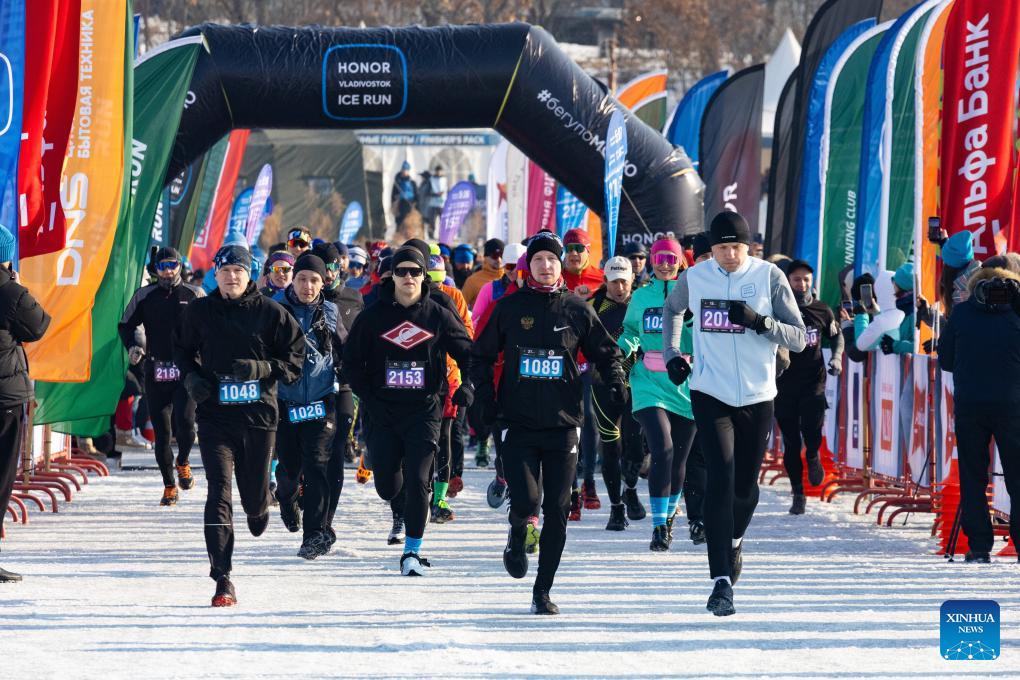 Participants take part in an ice half marathon held on the frozen sea in Vladivostok, Russia, Feb. 14, 2026. (Photo by Andrey Matveenko/Xinhua)