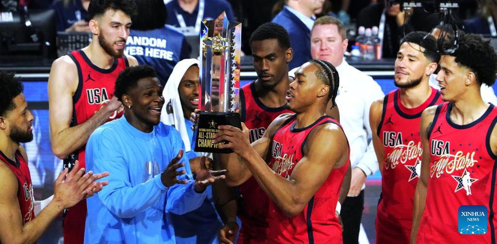 Team USA Stars lift the championship trophy after the NBA All Star Game between Team USA Stripes and Team USA Stars in Los Angeles, the United States, Feb. 15, 2026. (Xinhua/Wu Xiaoling)