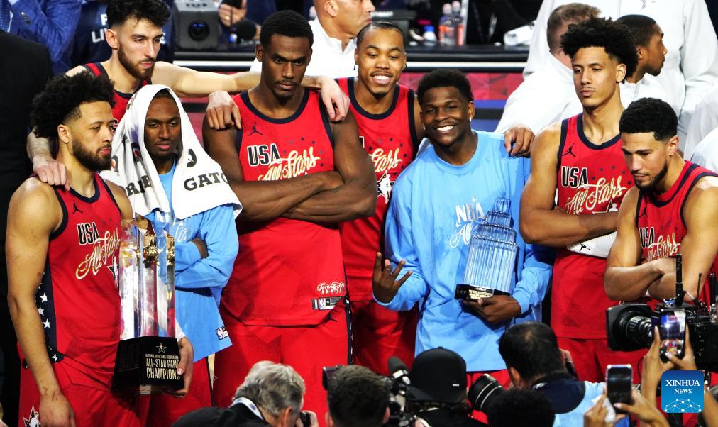 Team USA Stars pose with their trophies after the NBA All Star Game between Team USA Stripes and Team USA Stars in Los Angeles, the United States, Feb. 15, 2026. (Xinhua/Wu Xiaoling)