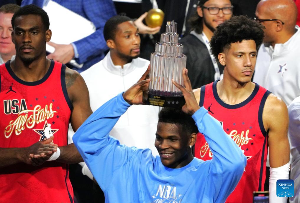 Team USA Stars' Anthony Edwards (front) lifts the MVP trophy after the NBA All Star Game between Team USA Stripes and Team USA Stars in Los Angeles, the United States, Feb. 15, 2026. (Xinhua/Wu Xiaoling)