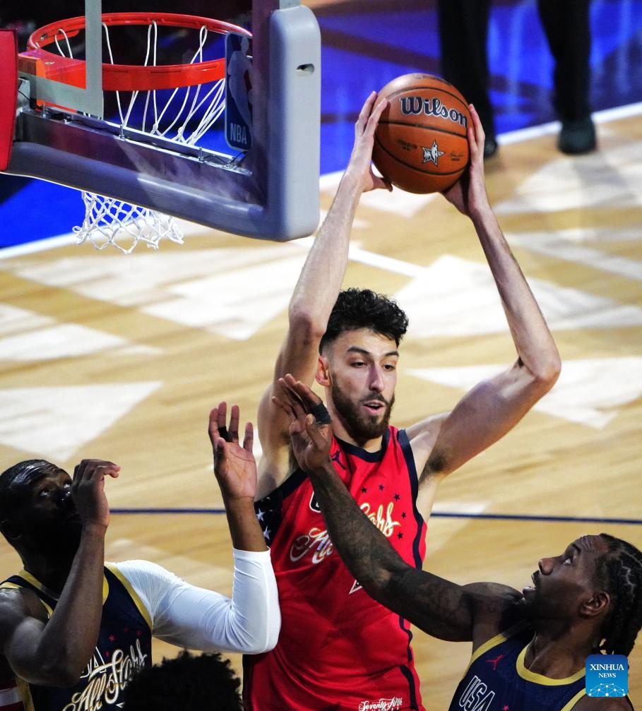 USA Stars' Chet Holmgren (top) competes during the NBA All Star Game between Team USA Stripes and Team USA Stars in Los Angeles, the United States, Feb. 15, 2026. (Xinhua/Wu Xiaoling)