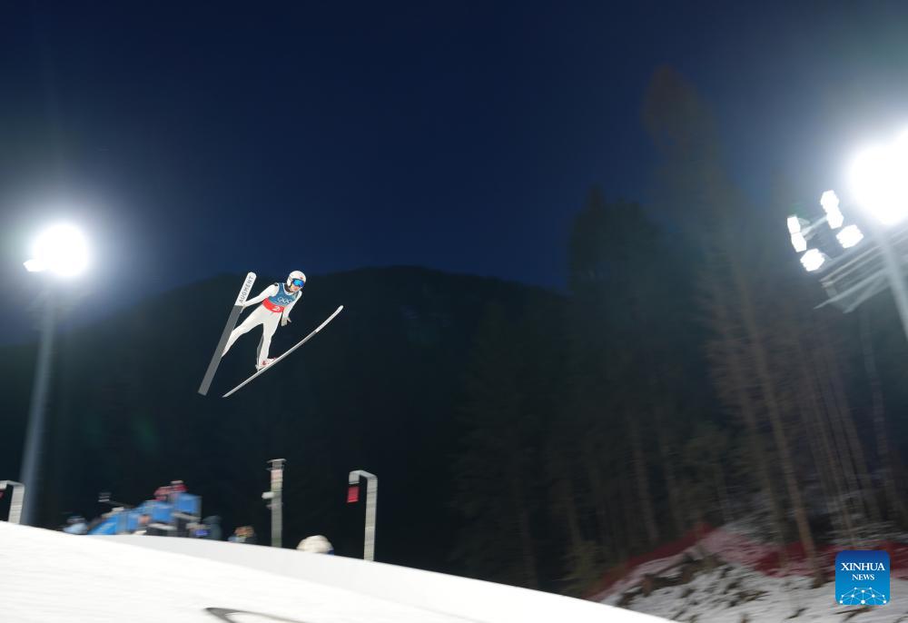 Song Qiwu of China competes during the trial round of the ski jumping men's super team event at the Milan-Cortina 2026 Olympic Winter Games in Predazzo, Italy, Feb. 16, 2026. (Xinhua/Meng Yongmin)