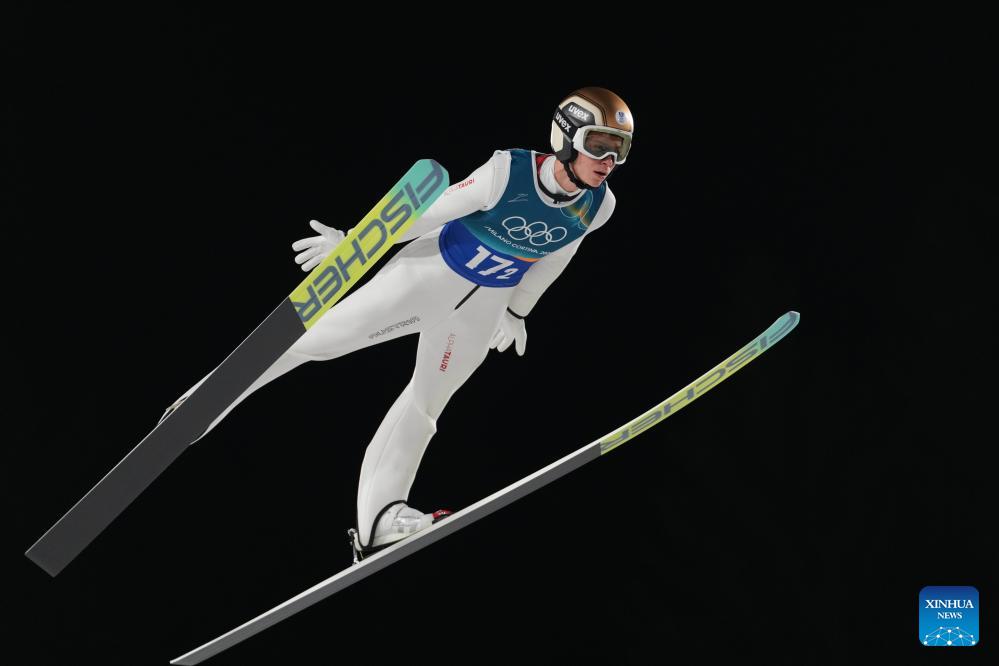 Stephan Embacher of Austria competes during the first round of the ski jumping men's super team event at the Milan-Cortina 2026 Olympic Winter Games in Predazzo, Italy, Feb. 16, 2026. (Xinhua/Meng Yongmin)