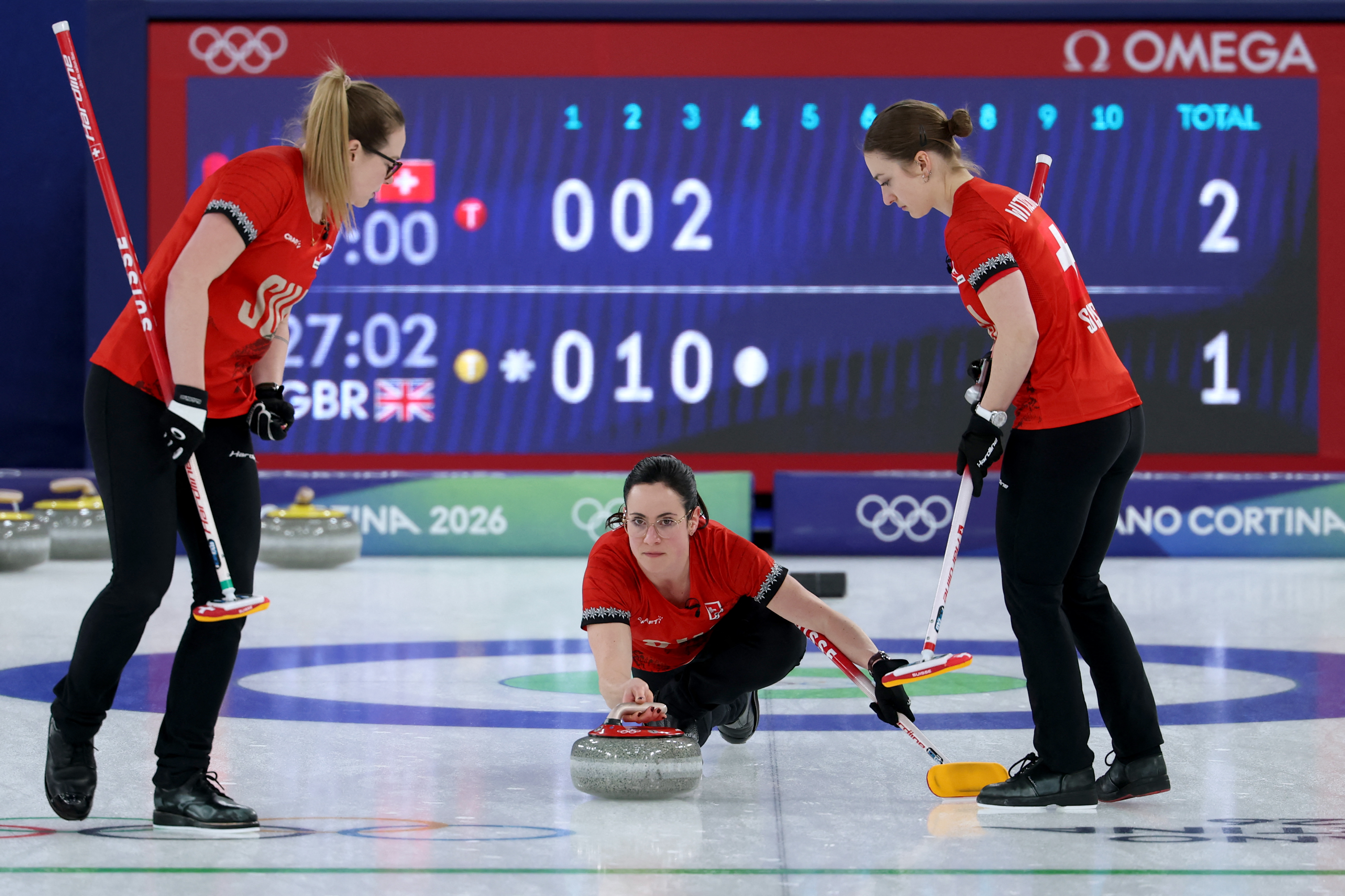 Switzerland's Alina Paetz (L) and Switzerland's Carole Howald and Switzerland's Selina Witschonke compete in the curling women's round robin between Switzerland and Britain during the Milano Cortina 2026 Winter Olympic Games at the Cortina Curling Olympic Stadium in Cortina d’Ampezzo on February 16, 2026. (Photo: AFP)