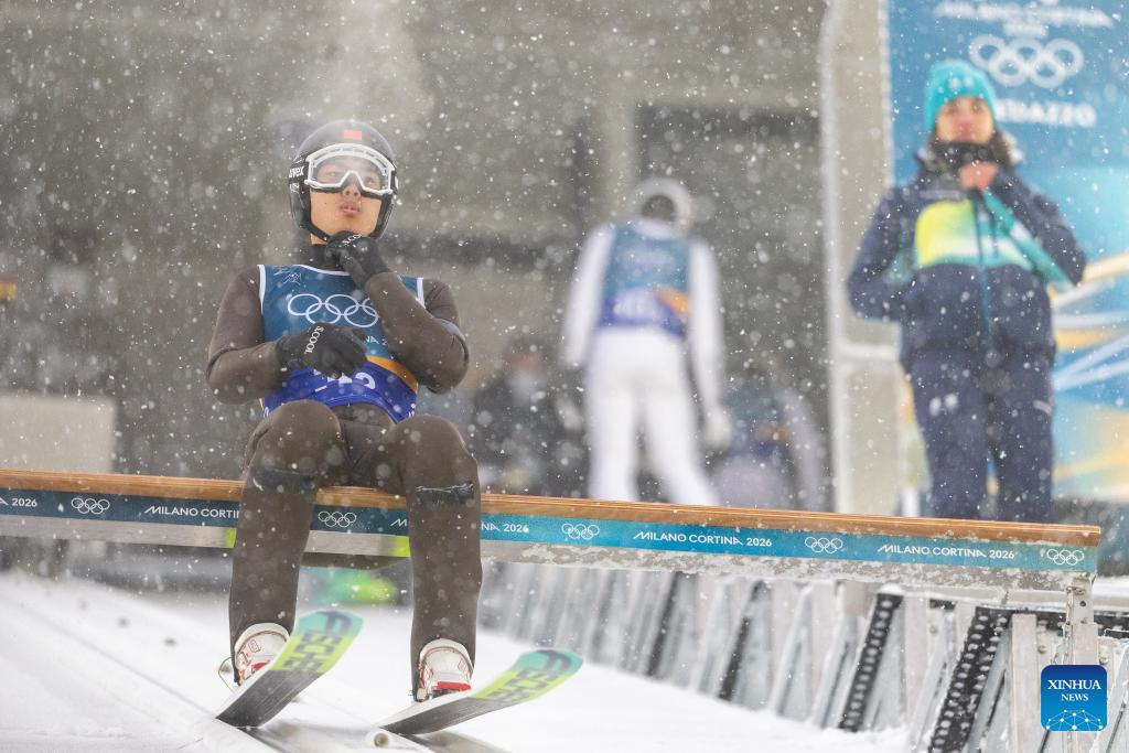 Watabe Akito of Japan competes during the ski jumping competition round of the nordic combined team sprint at the 2026 Milan-Cortina Winter Olympics in Predazzo, Italy, Feb. 19, 2026. (Xinhua/Meng Yongmin)