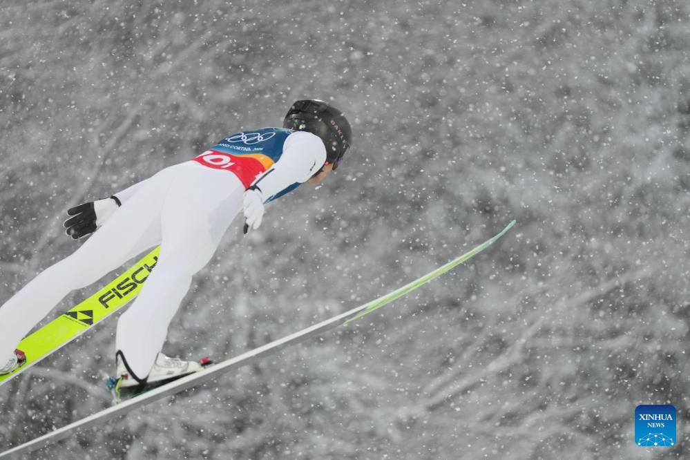 Zhao Zihe of China competes during the ski jumping competition round of the nordic combined team sprint at the 2026 Milan-Cortina Winter Olympics in Predazzo, Italy, Feb. 19, 2026. (Xinhua/Meng Yongmin)