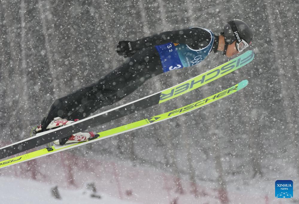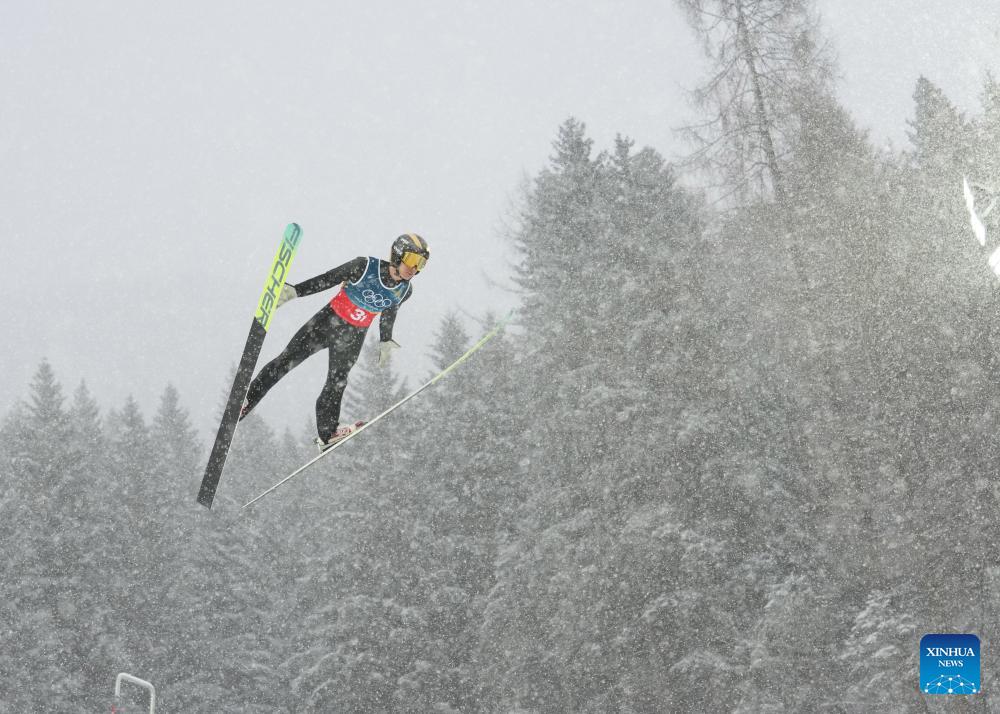 Zhao Jiawen of China is seen during the ski jumping trial round of the nordic combined team sprint at the 2026 Milan-Cortina Winter Olympics in Predazzo, Italy, Feb. 19, 2026. (Xinhua/Huang Wei)