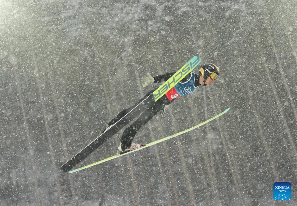 Johannes Rydzek of Germany competes during the ski jumping competition round of the nordic combined team sprint at the 2026 Milan-Cortina Winter Olympics in Predazzo, Italy, Feb. 19, 2026. (Xinhua/Meng Yongmin)