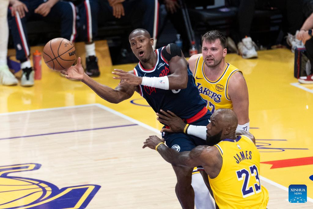 Los Angeles Clippers' Kris Dunn (C) vies with Los Angeles Lakers' LeBron James (front) and Luka Doncic during the 2025-2026 NBA regular season basketball game between Los Angeles Lakers and Los Angeles Clippers in Los Angeles, the United States, Feb. 20, 2026. (Photo by Ringo Chiu/Xinhua)