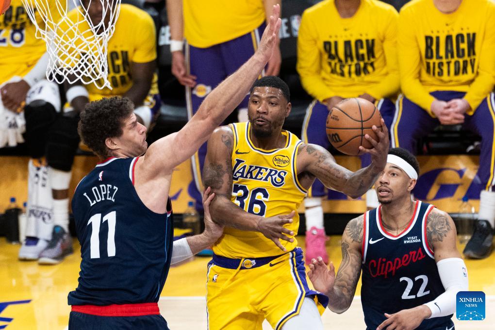 Los Angeles Clippers' Brook Lopez (L) blocks Los Angeles Lakers' Marcus Smart (C) during the 2025-2026 NBA regular season basketball game between Los Angeles Lakers and Los Angeles Clippers in Los Angeles, the United States, Feb. 20, 2026. (Photo by Ringo Chiu/Xinhua)