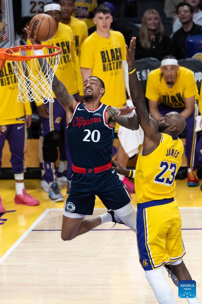 Los Angeles Clippers' John Collins (L) goes for a layup during the 2025-2026 NBA regular season basketball game between Los Angeles Lakers and Los Angeles Clippers in Los Angeles, the United States, Feb. 20, 2026. (Photo by Ringo Chiu/Xinhua)