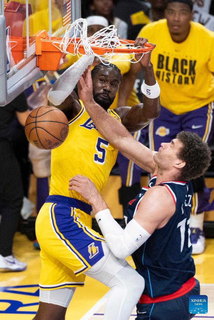 Los Angeles Lakers' Deandre Ayton (L) dunks against Los Angeles Clippers' Brook Lopez during the 2025-2026 NBA regular season basketball game between Los Angeles Lakers and Los Angeles Clippers in Los Angeles, the United States, Feb. 20, 2026. (Photo by Ringo Chiu/Xinhua)