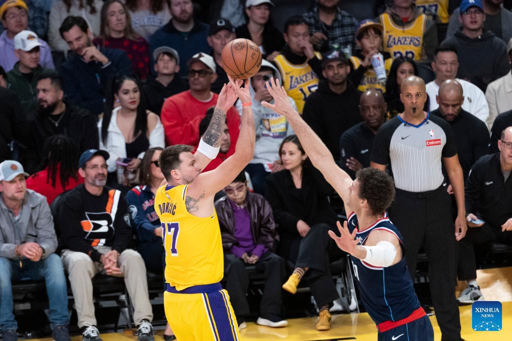 Los Angeles Lakers' Luka Doncic (L) shoots against Los Angeles Clippers' Brook Lopez during the 2025-2026 NBA regular season basketball game between Los Angeles Lakers and Los Angeles Clippers in Los Angeles, the United States, Feb. 20, 2026. (Photo by Ringo Chiu/Xinhua)