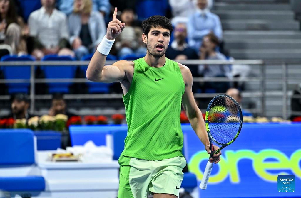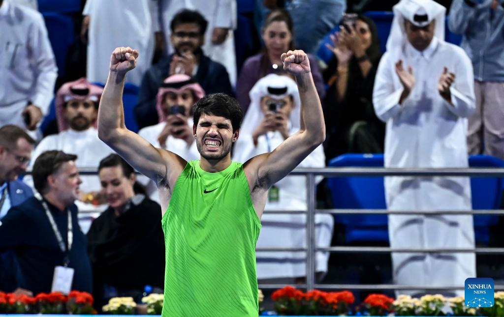 Carlos Alcaraz celebrates after winning the men's singles semi-final match between Carlos Alcaraz of Spain and Andrey Rublev of Russia at the ATP Qatar Open 2026 tennis tournament in Doha, Qatar, on Feb. 20, 2026. (Photo by Nikku/Xinhua)
