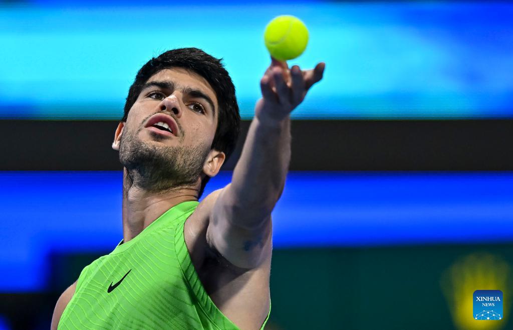 Carlos Alcaraz serves during the men's singles semi-final match between Carlos Alcaraz of Spain and Andrey Rublev of Russia at the ATP Qatar Open 2026 tennis tournament in Doha, Qatar, on Feb. 20, 2026. (Photo by Nikku/Xinhua)