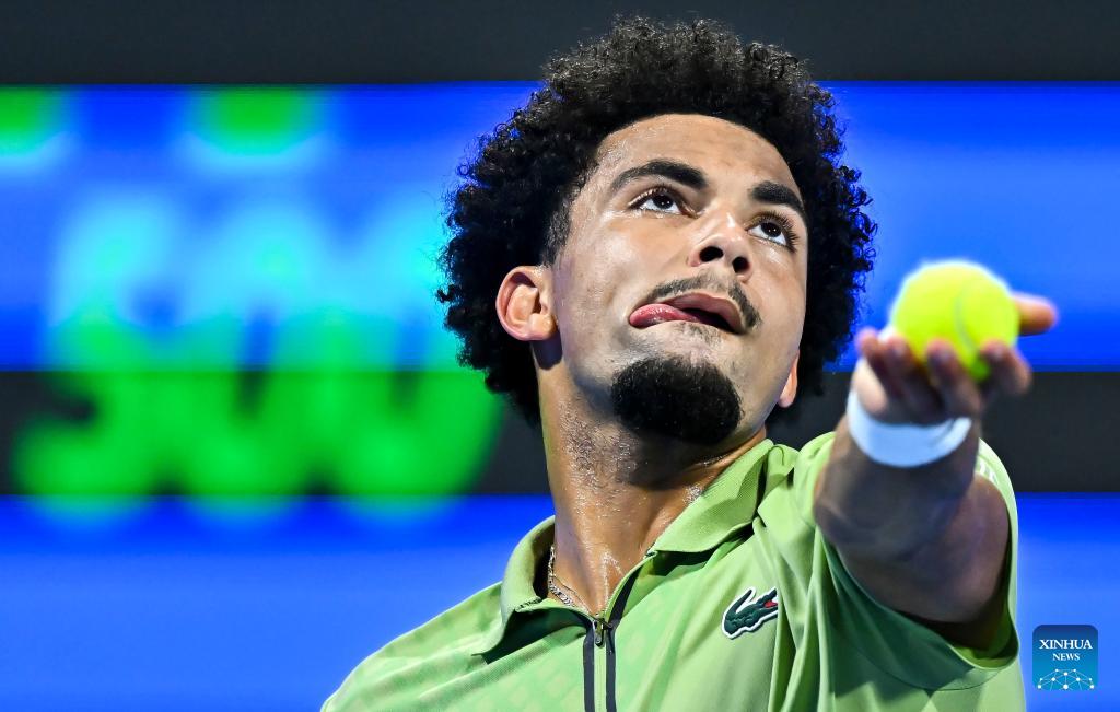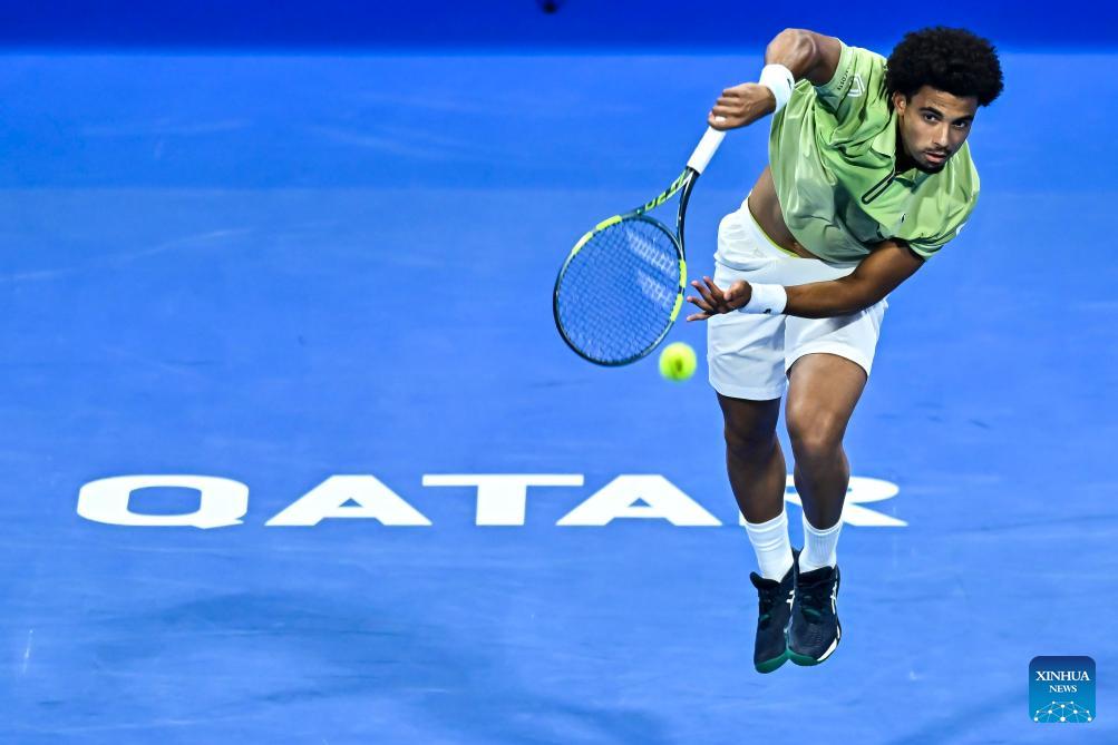 Arthur Fils serves during the men's singles semi-final match between Jakub Mensik of the Czech Republic and Arthur Fils of France at the ATP Qatar Open 2026 tennis tournament in Doha, Qatar, on Feb. 20, 2026. (Photo by Nikku/Xinhua)