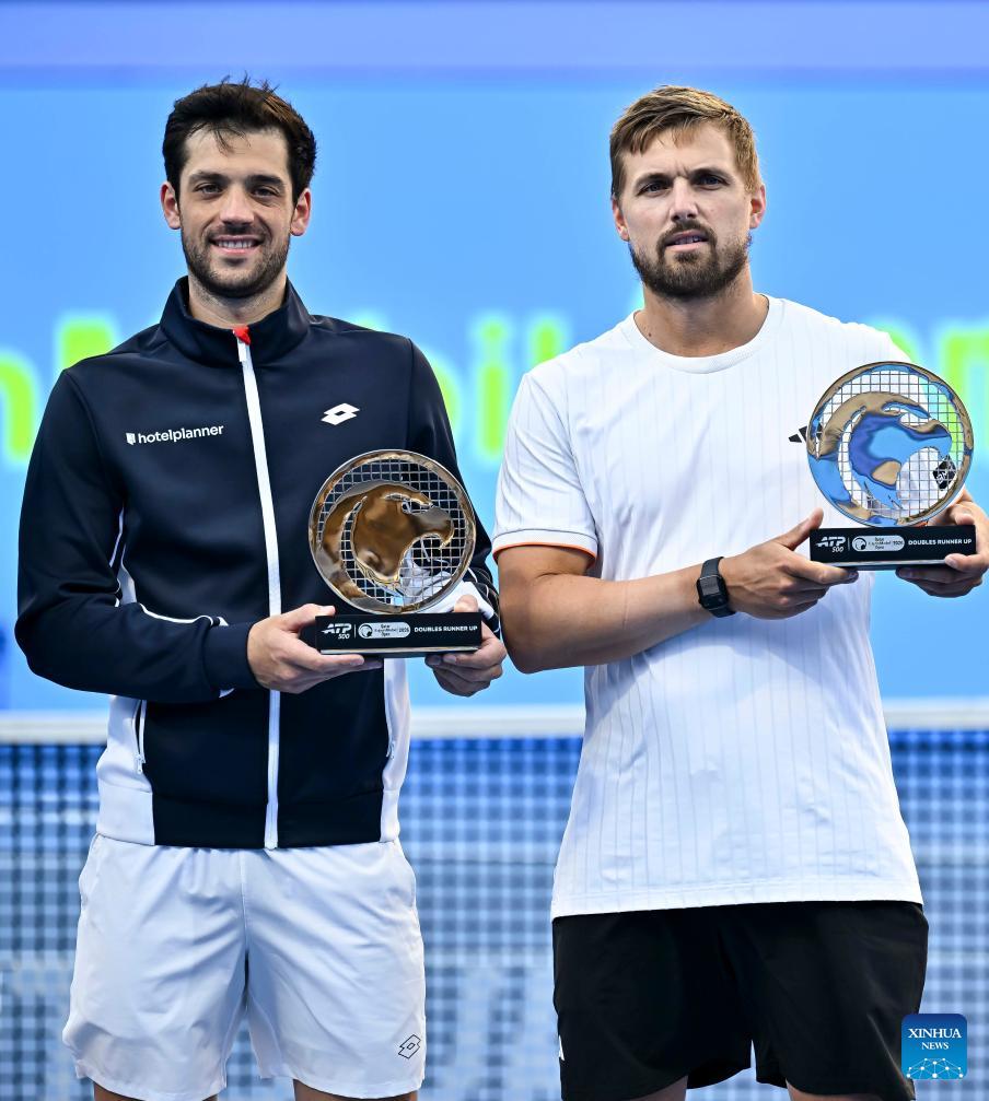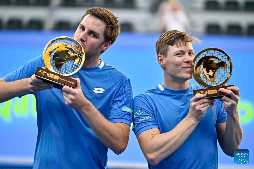 Winners Harri Heliovaara (R)/Henry Patten pose for photos during the awarding ceremony of the men's doubles final match between Harri Heliovaara of Finland/Henry Patten of Britain and Julian Cash/Lloyd Glasspool of Britain at the ATP Qatar Open 2026 tennis tournament in Doha, Qatar, on Feb. 20, 2026. (Photo by Nikku/Xinhua)