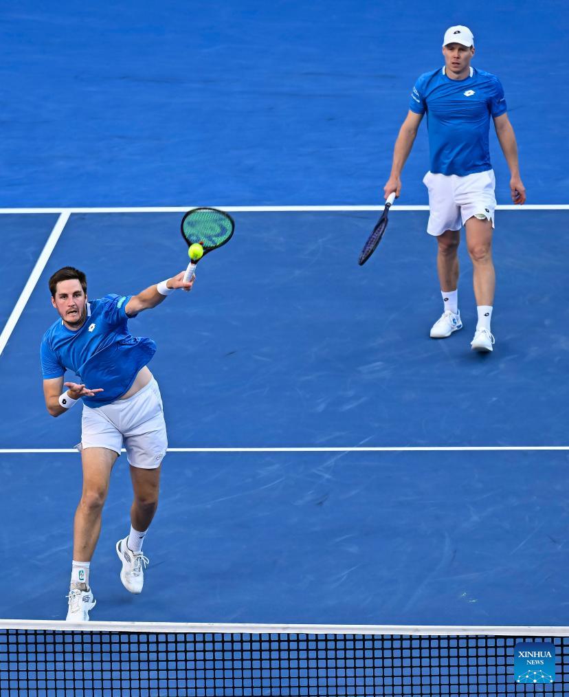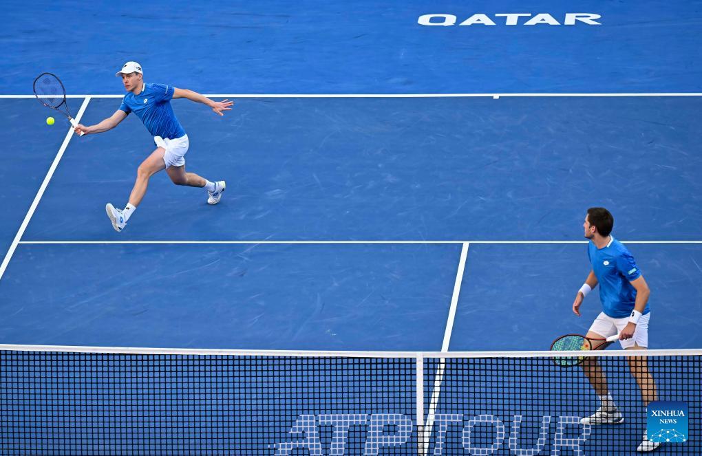 Harri Heliovaara/Henry Patten (L) compete during the men's doubles final match between Harri Heliovaara of Finland/Henry Patten of Britain and Julian Cash/Lloyd Glasspool of Britain at the ATP Qatar Open 2026 tennis tournament in Doha, Qatar, on Feb. 20, 2026. (Photo by Nikku/Xinhua)