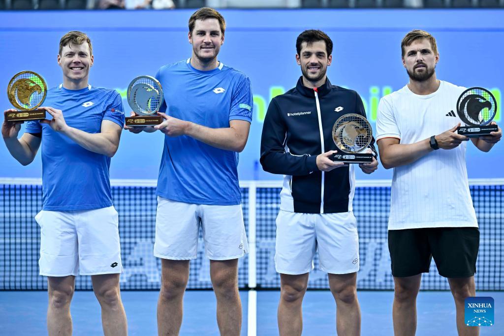 Winners Harri Heliovaara (1st L)/Henry Patten (2nd L) and runners-up Julian Cash (2nd R)/Lloyd Glasspool pose for photos during the awarding ceremony of the men's doubles final match between Harri Heliovaara of Finland/Henry Patten of Britain and Julian Cash/Lloyd Glasspool of Britain at the ATP Qatar Open 2026 tennis tournament in Doha, Qatar, on Feb. 20, 2026. (Photo by Nikku/Xinhua)