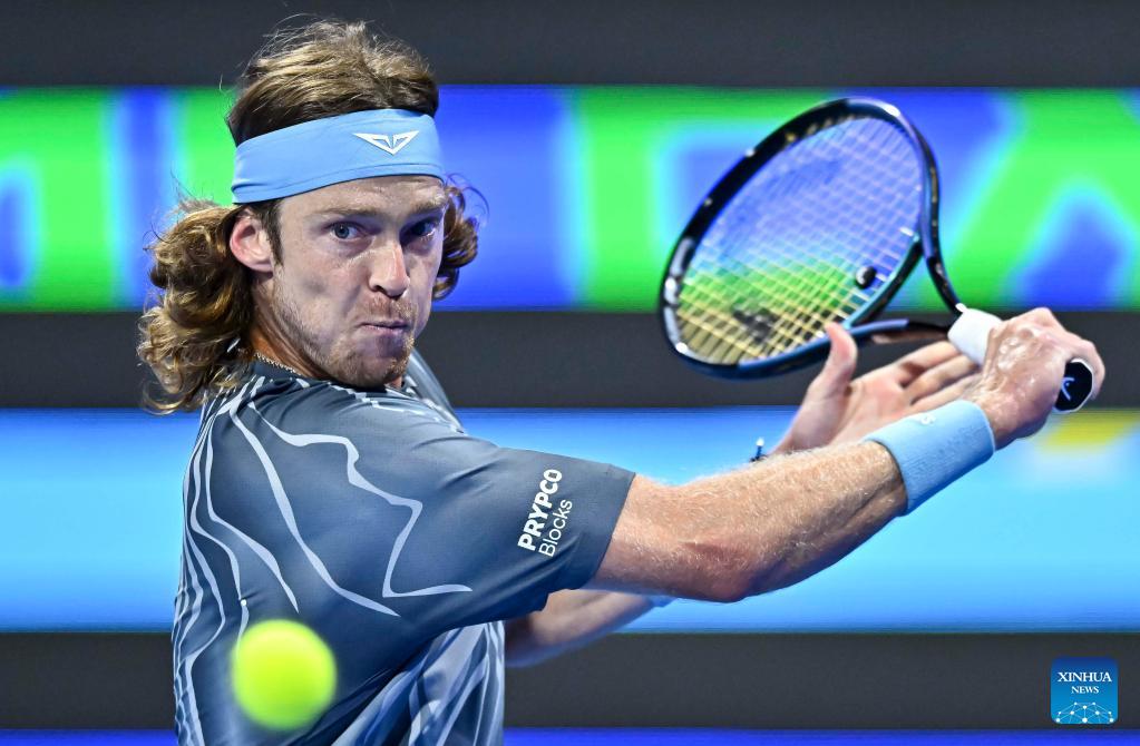 Andrey Rublev hits a return during the men's singles semi-final match between Carlos Alcaraz of Spain and Andrey Rublev of Russia at the ATP Qatar Open 2026 tennis tournament in Doha, Qatar, on Feb. 20, 2026. (Photo by Nikku/Xinhua)