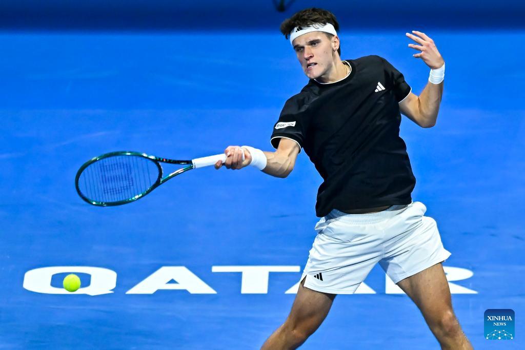 Arthur Fils hits a return during the men's singles semi-final match between Jakub Mensik of the Czech Republic and Arthur Fils of France at the ATP Qatar Open 2026 tennis tournament in Doha, Qatar, on Feb. 20, 2026. (Photo by Nikku/Xinhua)