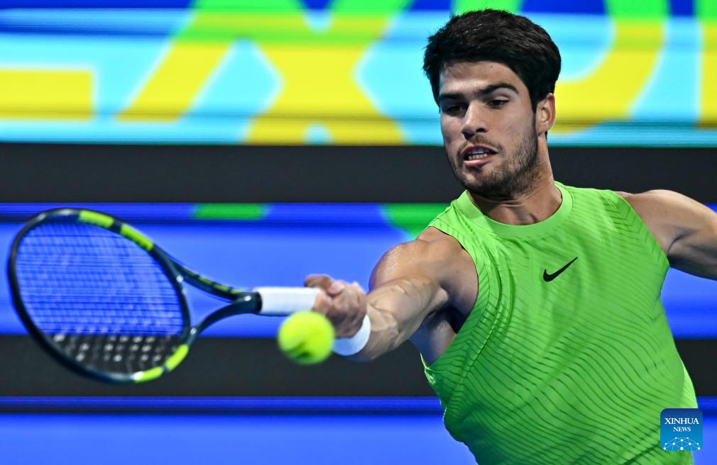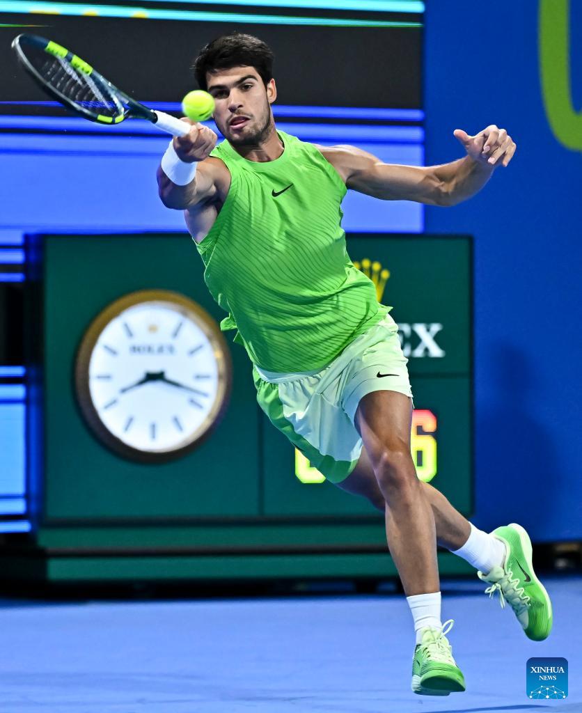 Carlos Alcaraz hits a return during the men's singles semi-final match between Carlos Alcaraz of Spain and Andrey Rublev of Russia at the ATP Qatar Open 2026 tennis tournament in Doha, Qatar, on Feb. 20, 2026. (Photo by Nikku/Xinhua)