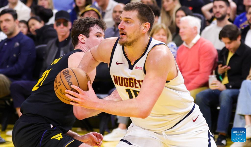 Nikola Jokic (R) of Denver Nuggets vies for the ball during the 2025-2026 NBA regular season game between Golden State Warriors and Denver Nuggets in San Francisco, the United States, February 22, 2026. (Photo: Xinhua)