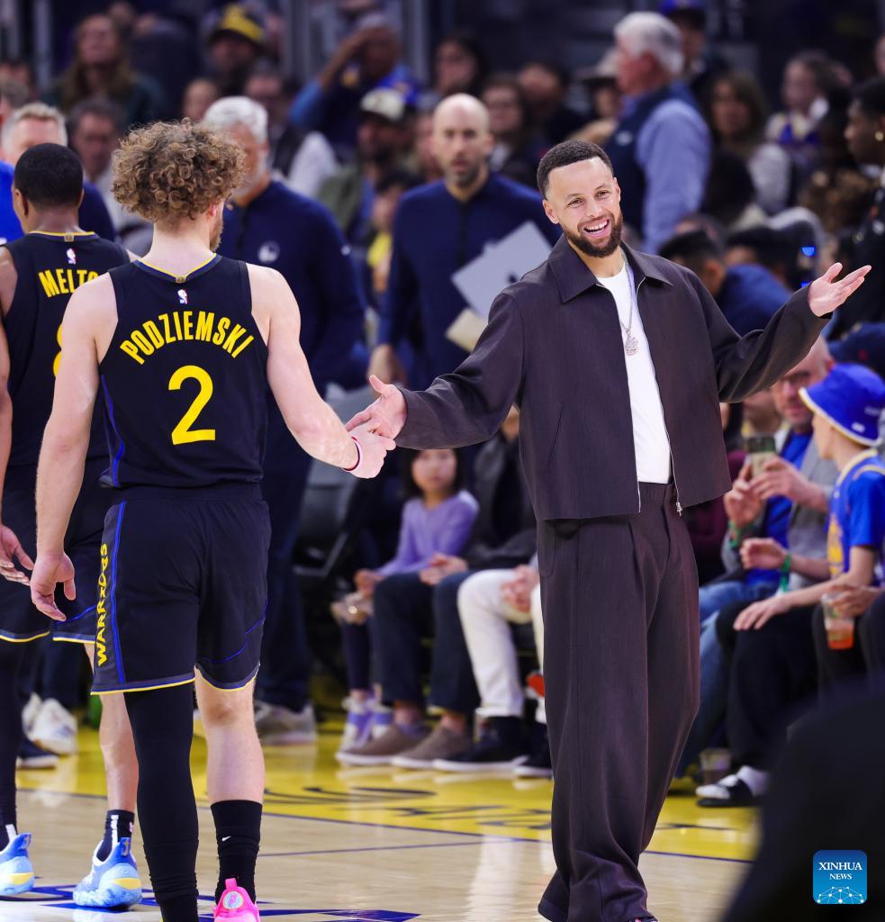 Brandin Podziemski (L) of Golden State Warriors interacts with teammate Stephen Curry during the 2025-2026 NBA regular season game between Golden State Warriors and Denver Nuggets in San Francisco, the United States, February 22, 2026. (Photo: Xinhua)
