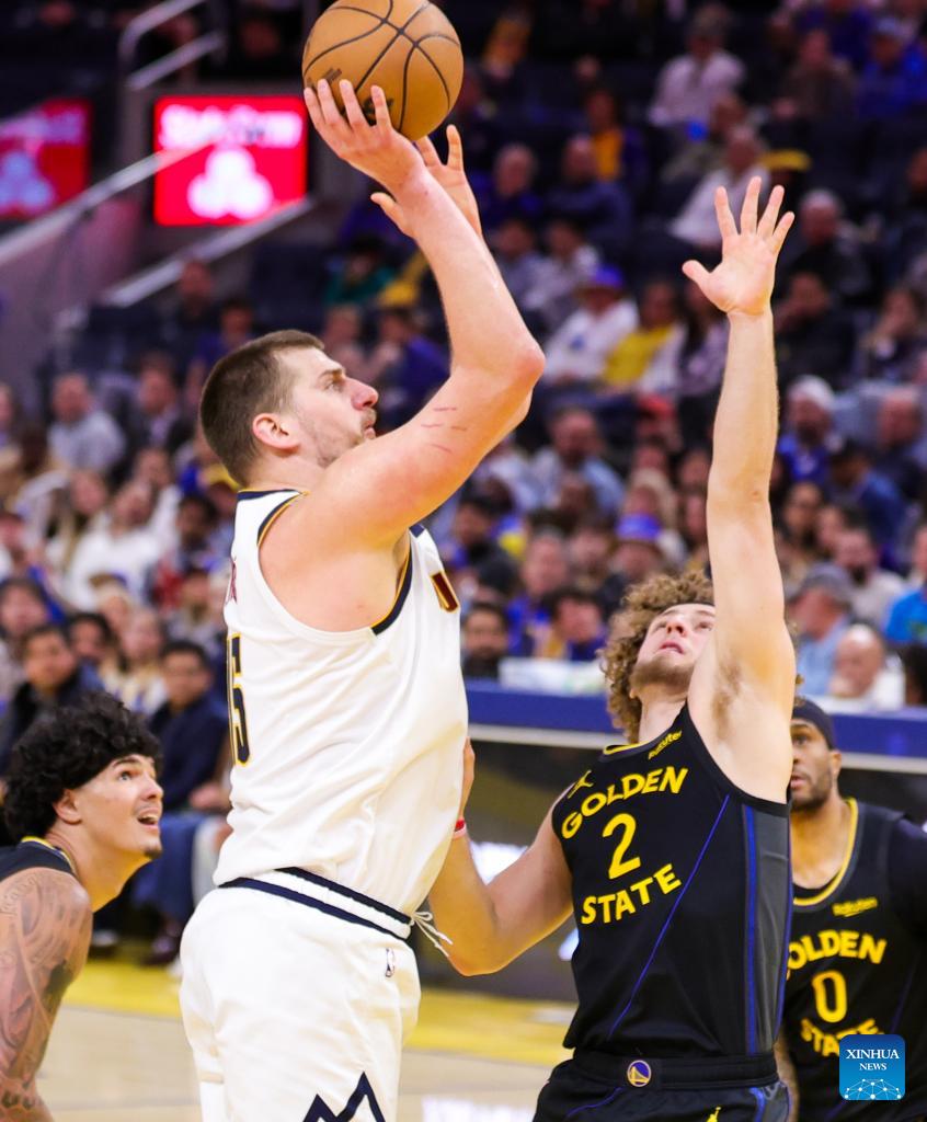 Nikola Jokic (L) of Denver Nuggets shoots during the 2025-2026 NBA regular season game between Golden State Warriors and Denver Nuggets in San Francisco, the United States, February 22, 2026. (Photo: Xinhua)