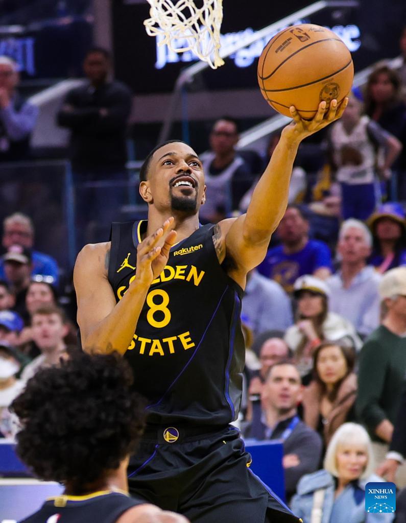 De'Anthony Melton of Golden State Warriors goes for a layup during the 2025-2026 NBA regular season game between Golden State Warriors and Denver Nuggets in San Francisco, the United States, February 22, 2026. (Photo: Xinhua)
