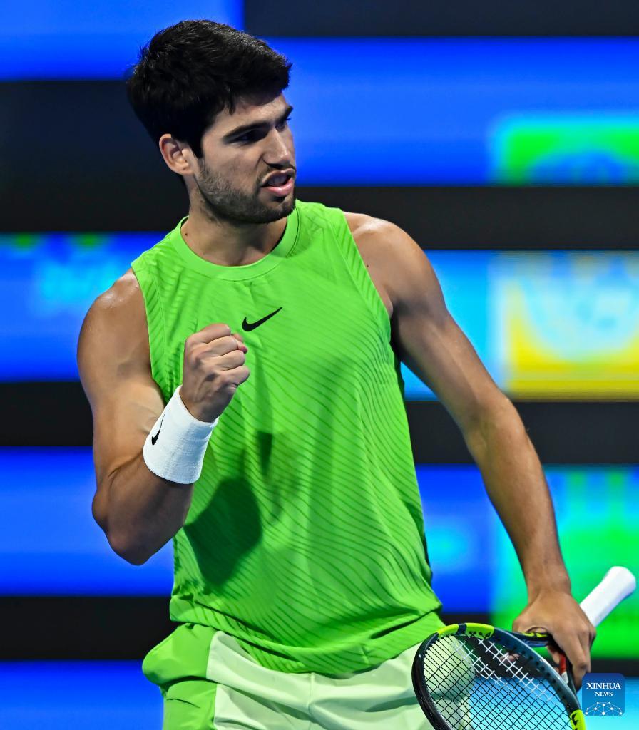Carlos Alcaraz reacts during the men's singles final match between Carlos Alcaraz of Spain and Arthur Fils of France at the ATP Qatar Open 2026 tennis tournament final in Doha, Qatar, on Feb. 21, 2026. (Photo by Nikku/Xinhua)