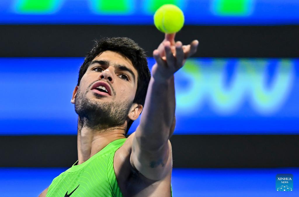 Carlos Alcaraz serves during the men's singles final match between Carlos Alcaraz of Spain and Arthur Fils of France at the ATP Qatar Open 2026 tennis tournament final in Doha, Qatar, on Feb. 21, 2026. (Photo by Nikku/Xinhua)