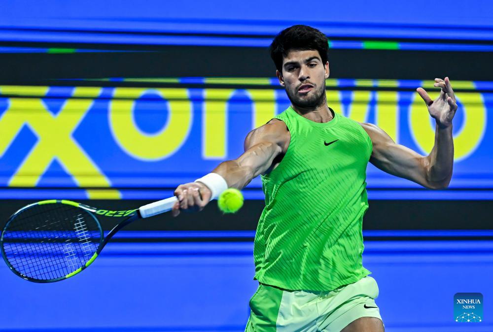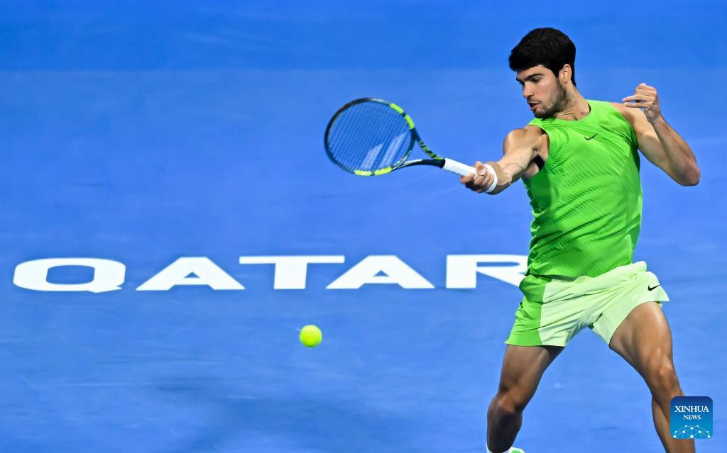 Carlos Alcaraz hits a return during the men's singles final match between Carlos Alcaraz of Spain and Arthur Fils of France at the ATP Qatar Open 2026 tennis tournament final in Doha, Qatar, on Feb. 21, 2026. (Photo by Nikku/Xinhua)