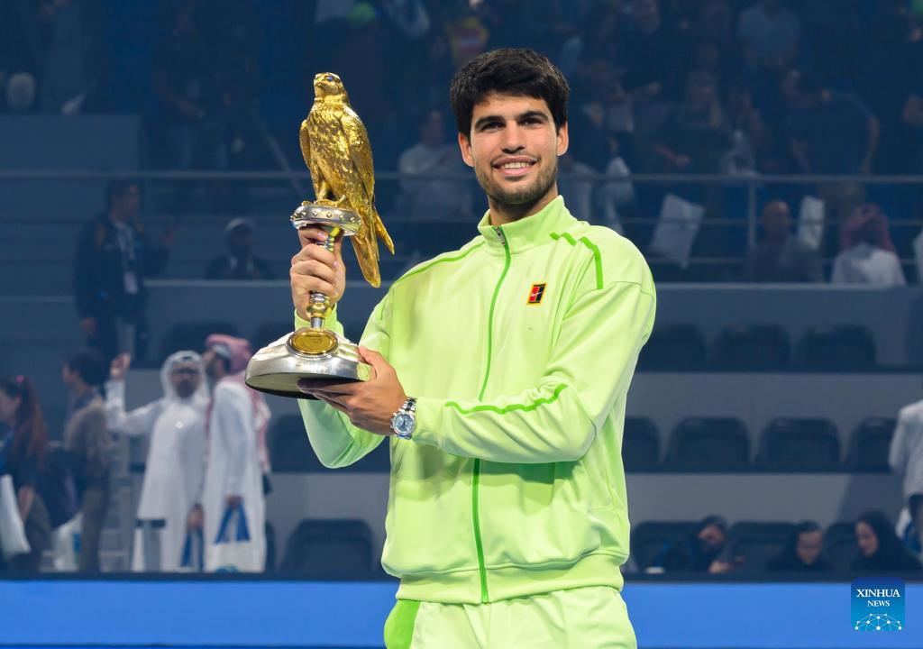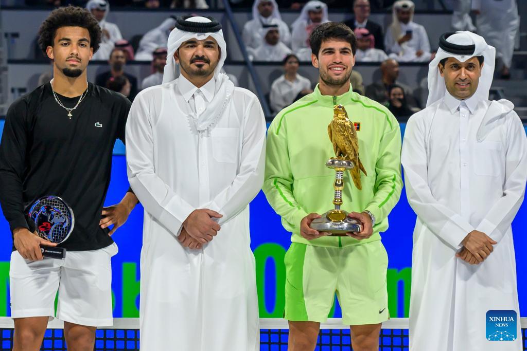 Champion Carlos Alcaraz poses with the trophy during the awarding ceremony after the men's singles final match between Carlos Alcaraz of Spain and Arthur Fils of France at the ATP Qatar Open 2026 tennis tournament final in Doha, Qatar, on Feb. 21, 2026. (Photo by Nikku/Xinhua)