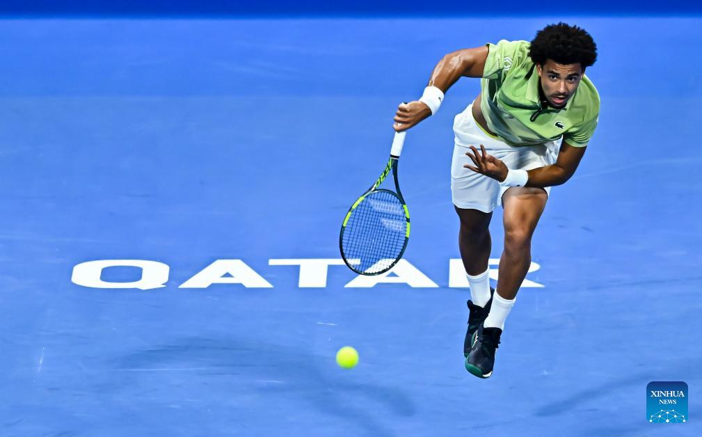 Arthur Fils competes during the men's singles final match between Carlos Alcaraz of Spain and Arthur Fils of France at the ATP Qatar Open 2026 tennis tournament final in Doha, Qatar, on Feb. 21, 2026. (Photo by Nikku/Xinhua)