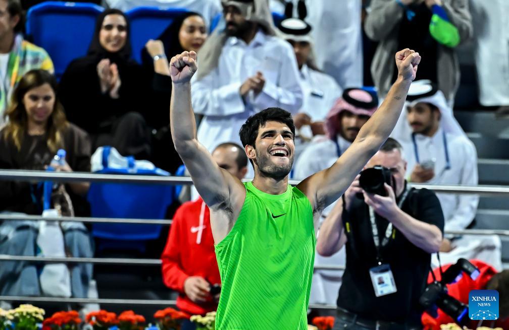 Carlos Alcaraz celebrates after winning the men's singles final match between Carlos Alcaraz of Spain and Arthur Fils of France at the ATP Qatar Open 2026 tennis tournament final in Doha, Qatar, on Feb. 21, 2026. (Photo by Nikku/Xinhua)