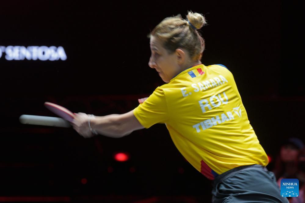 Elizabeta Samara of Romania hits a return during the women's singles round of 32 match between Sun Yingsha of China and Elizabeta Samara of Romania at the World Table Tennis (WTT) Singapore Smash 2026 in Singapore on Feb. 25, 2026. (Photo by Then Chih Wey/Xinhua)