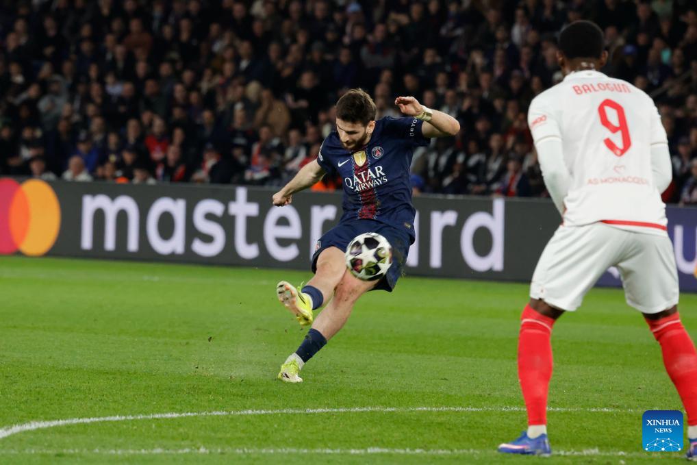 PSG's Khvicha Kvaratskhelia (L) shoots during the UEFA Champions League play-off second leg football match between Paris Saint-Germain (PSG) and AS Monaco in Paris, France, Feb. 25, 2026. (Photo by Henri Szwarc/Xinhua)