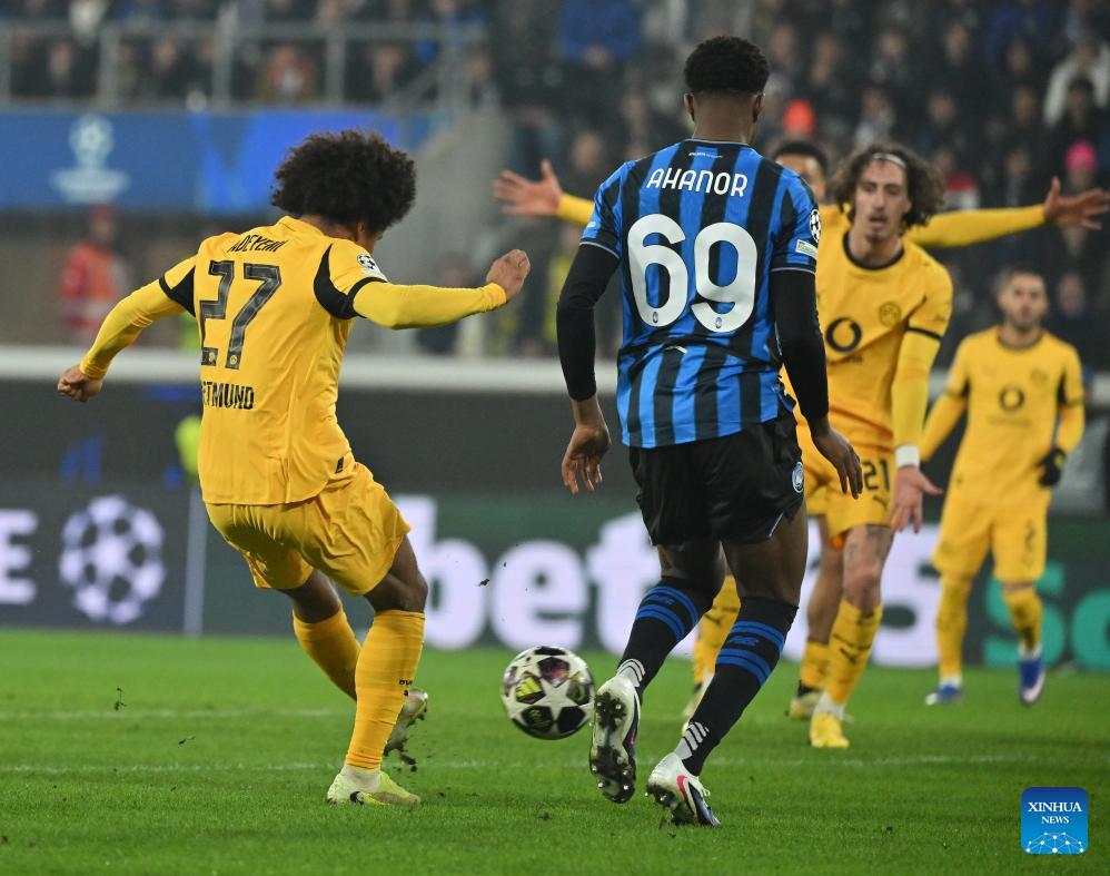 Borussia Dortmund's Karim Adeyemi (L) scores during the UEFA Champions League play-off 2nd leg match between Atalanta and Borussia Dortmund in Bergamo, Italy, Feb. 25, 2026. (Photo by Alberto Lingria/Xinhua)