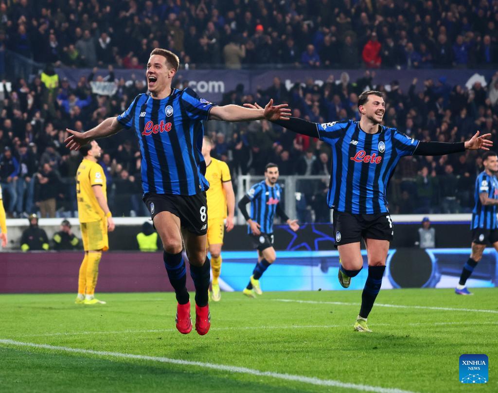 Atalanta's Mario Pasalic (L) celebrates his goal during the UEFA Champions League play-off 2nd leg match between Atalanta and Borussia Dortmund in Bergamo, Italy, Feb. 25, 2026. (Photo by Alberto Lingria/Xinhua)