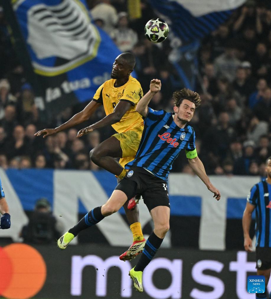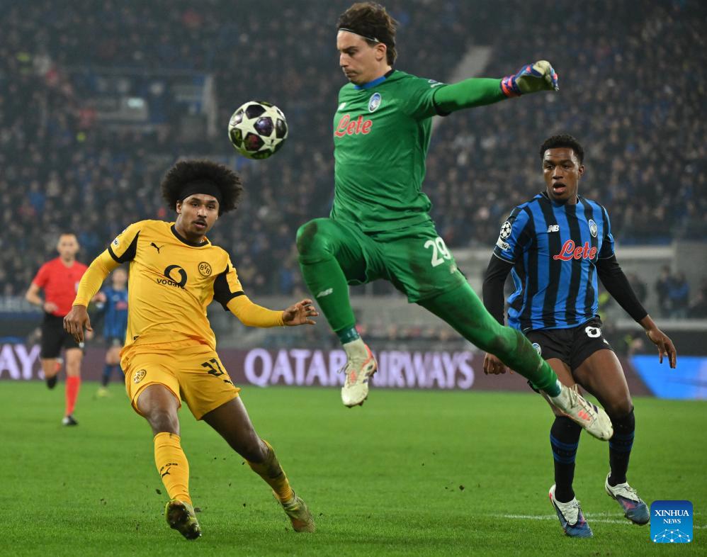 Borussia Dortmund's Karim Adeyemi (L) vies with Atalanta's Marco Carnesecchi (C) and Honest Ahanor during the UEFA Champions League play-off 2nd leg match between Atalanta and Borussia Dortmund in Bergamo, Italy, Feb. 25, 2026. (Photo by Alberto Lingria/Xinhua)