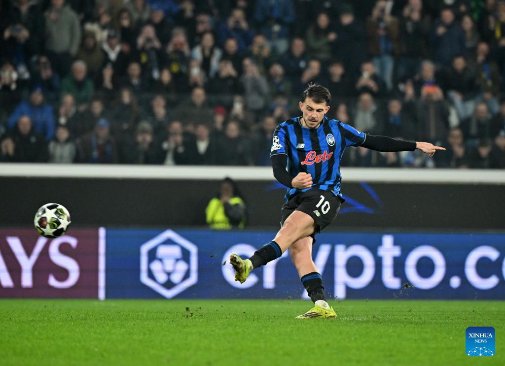 Atalanta's Lazar Samardzic scores a penalty goal during the UEFA Champions League play-off 2nd leg match between Atalanta and Borussia Dortmund in Bergamo, Italy, Feb. 25, 2026. (Photo by Alberto Lingria/Xinhua)