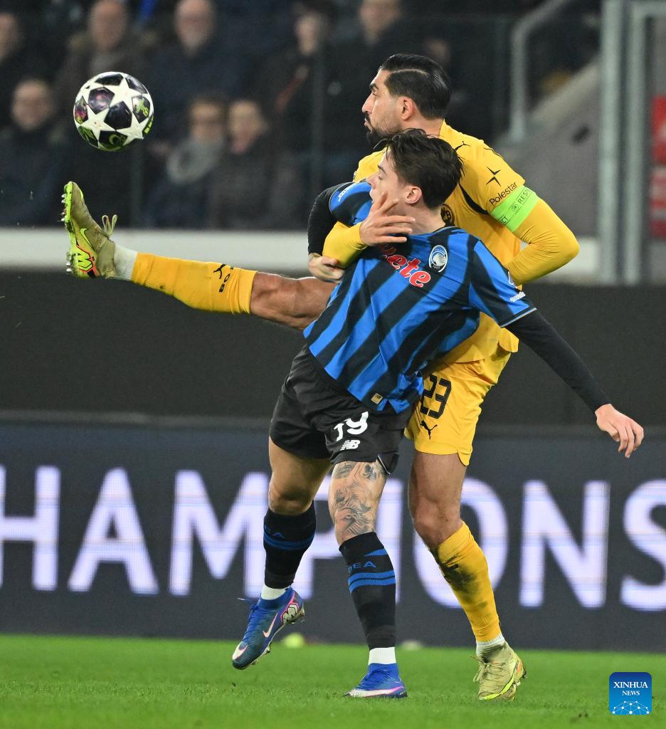 Borussia Dortmund's Emre Can (R) vies with Atalanta's Nicola Zalewski during the UEFA Champions League play-off 2nd leg match between Atalanta and Borussia Dortmund in Bergamo, Italy, Feb. 25, 2026. (Photo by Alberto Lingria/Xinhua)