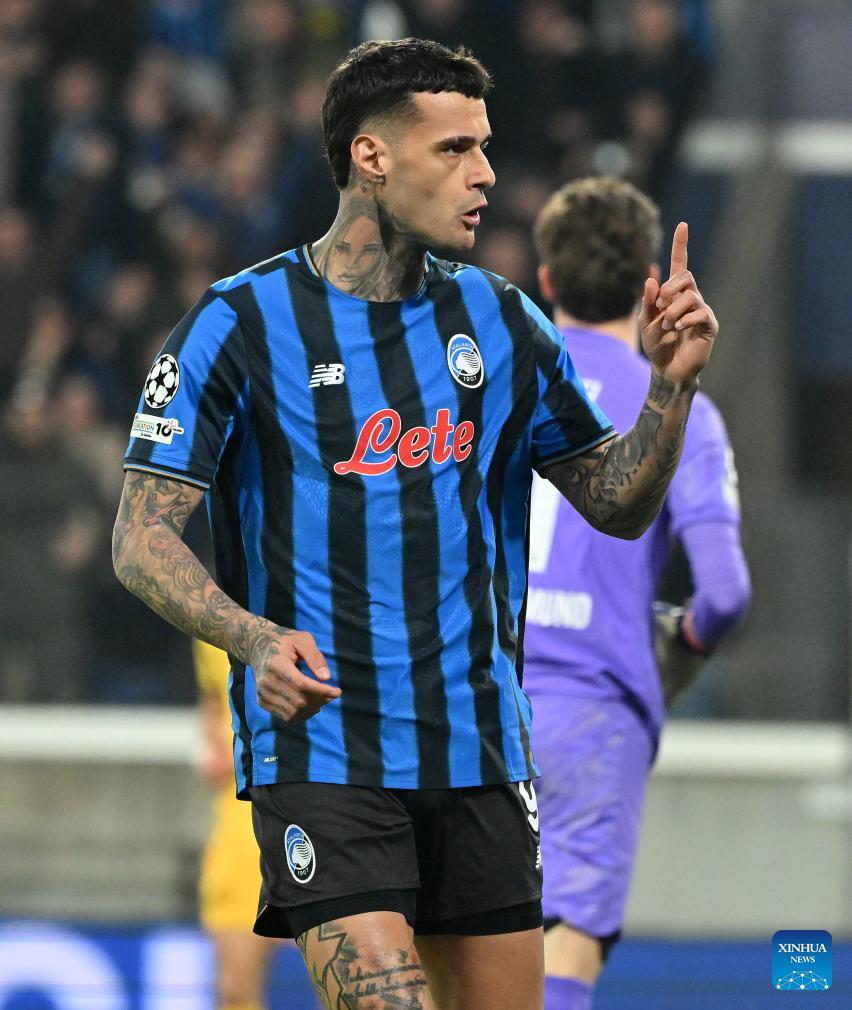 Atalanta's Gianluca Scamacca celebrates his goal during the UEFA Champions League play-off 2nd leg match between Atalanta and Borussia Dortmund in Bergamo, Italy, Feb. 25, 2026. (Photo by Alberto Lingria/Xinhua)