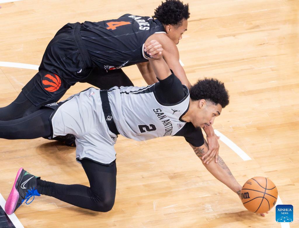 Scottie Barnes (top) of Toronto Raptors vies with Dylan Harper of San Antonio Spurs during the 2025-2026 NBA regular season game between Toronto Raptors and San Antonio Spurs in Toronto, Canada, on Feb. 25, 2026. (Photo by Zou Zheng/Xinhua)