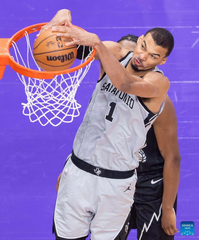 Victor Wembanyama of San Antonio Spurs dunks during the 2025-2026 NBA regular season game between Toronto Raptors and San Antonio Spurs in Toronto, Canada, on Feb. 25, 2026. (Photo by Zou Zheng/Xinhua)