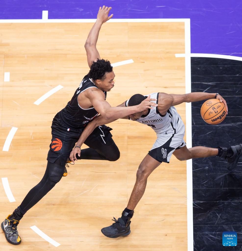 Stephon Castle (C) of San Antonio Spurs dunks during the 2025-2026 NBA regular season game between Toronto Raptors and San Antonio Spurs in Toronto, Canada, on Feb. 25, 2026. (Photo by Zou Zheng/Xinhua)